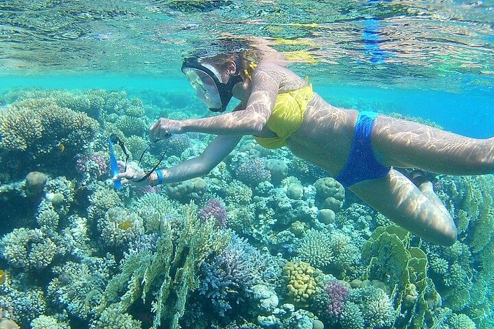 Your journey begins with a scenic boat ride over the turquoise waters of the Red Sea. Along the way, you'll stop at two vibrant coral reef sites for guided snorkeling sessions.